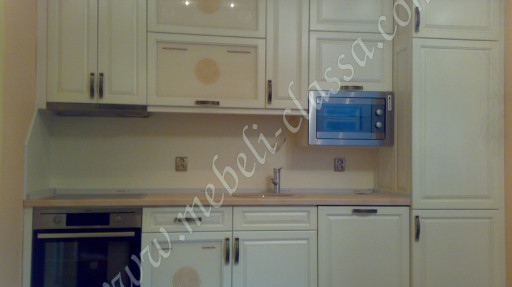 17Wed Кухня 42 Модерна кухня, изработена от масив бук в бял цвят, с вградени фурна, абсорбатор, миялна машина и хладилник.
